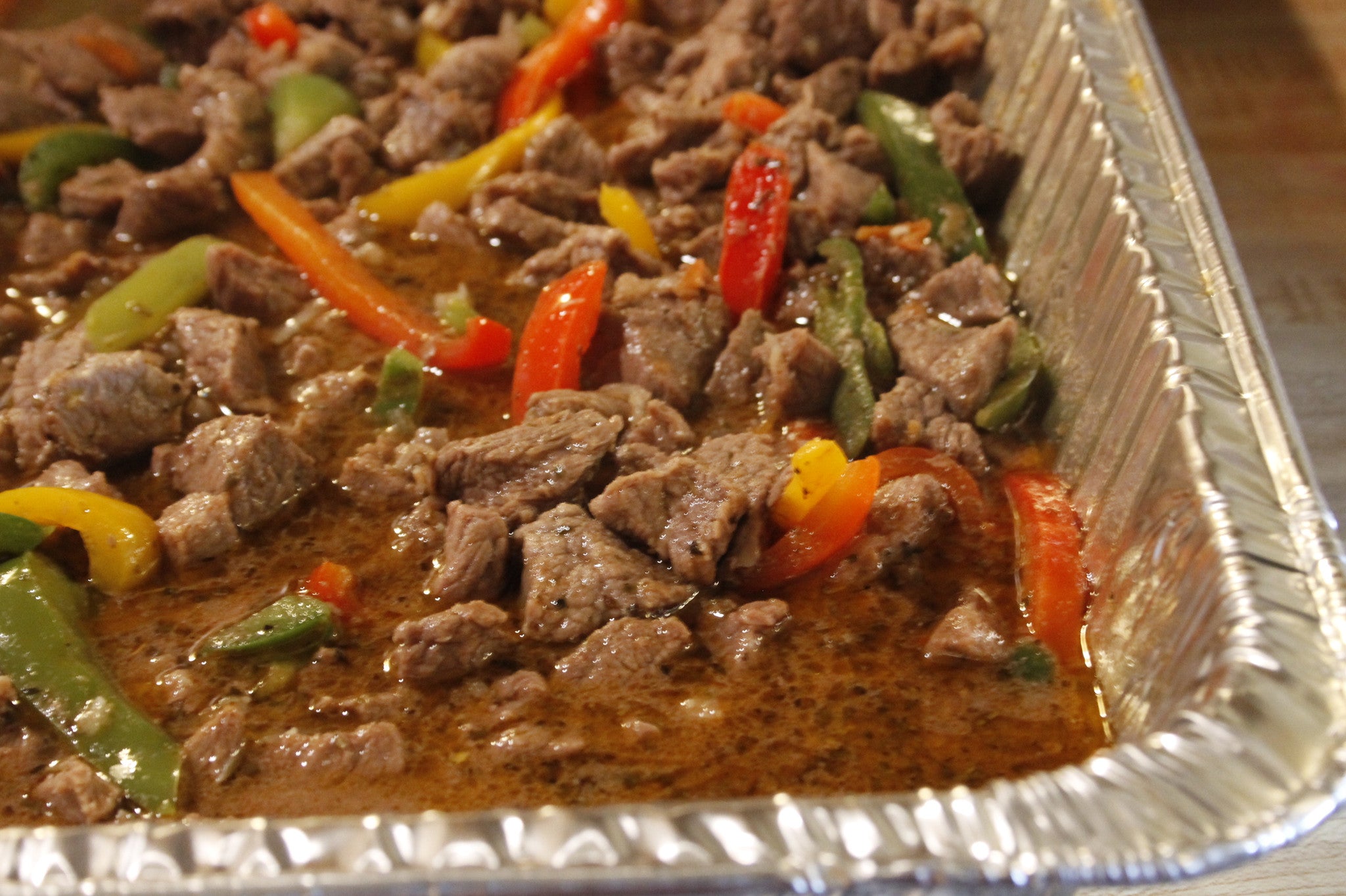 Lower heat, add beef and thinly sliced or diced bell pepper, turning regularly, until cooked through, about another 10 minutes. If cooking dry beef, cook in separate pan first, then add to onions and bell pepper. If using marinated beef, go ahead and add to already sauteed onions with bell pepper.